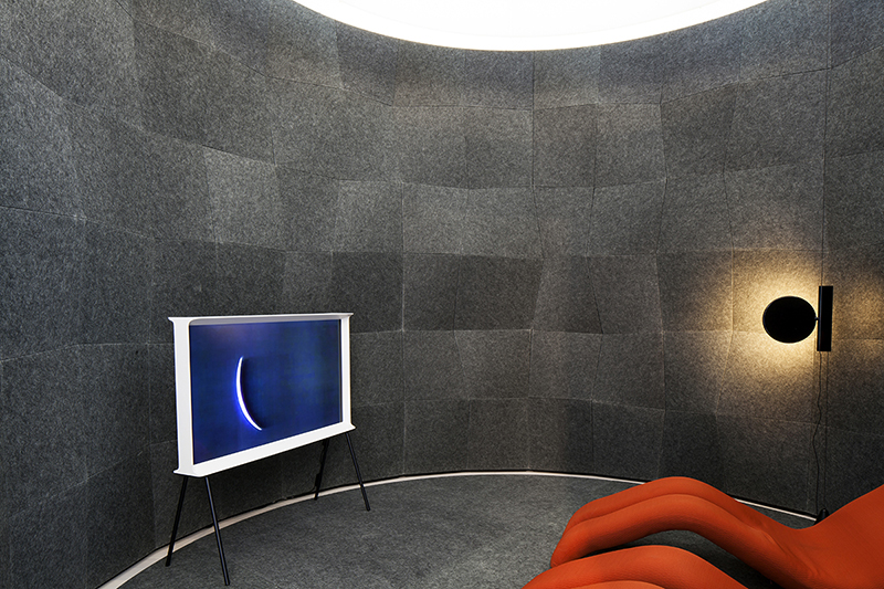 In addition to introducing new acoustic lighting designs from its LightArt brand, 3form unveiled its new Acoustic Solutions, which combines a new 50% pre-consumer recycled PET felt with its Seeyond and Edge systems.