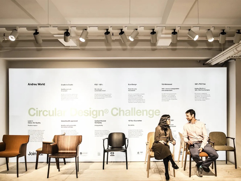 In 2022, the manufacturer was the first in the world to have its entire product range Cradle to Cradle-certified, just one example of the company’s dedication to positive action and environmental stewardship. The showroom includes a large panel that details the company’s Circular Design Challenge, launched with the goal of achieving full circularity by 2025.