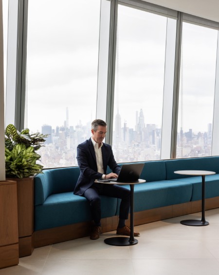 On the 58th floor of the building, visual access was a key driver, and the layout meets both programmatic needs and maximizes the vistas. Sightlines to the world’s most recognizable skyline are not only for the C-suite, and this mandate set the tone for the project. From the reception area, and beyond, the most striking views were intentionally reserved for the spaces that welcome guests and foster community.