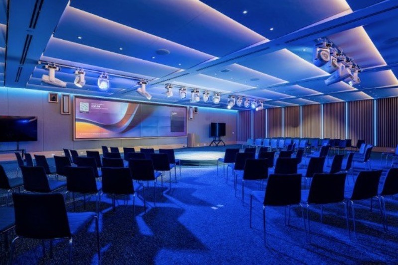 Inside the conference room, reconfigurable furnishings allow rapid transitions between board meetings and auditorium-style presentations. Advanced audiovisual integration — speakers, cameras, stage lighting and a large presentation screen — supports high-quality broadcasts and hybrid gatherings. In a building more than seven decades old, that level of coordination required careful technical planning.