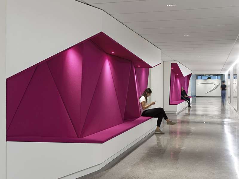 One corridor boasts fractal-wall niche seating and upholstered faceted panels in a vibrant fuchsia fabric. Another features a blue triangular faceted spiral design element built of powder-coated metal with an upholstered panel attached to each facet face. The continuous, ribbonlike installation, 83-feet long, 12-feet wide and 9-feet tall, comprises 29 individual facets making up benches, canopies and walls.