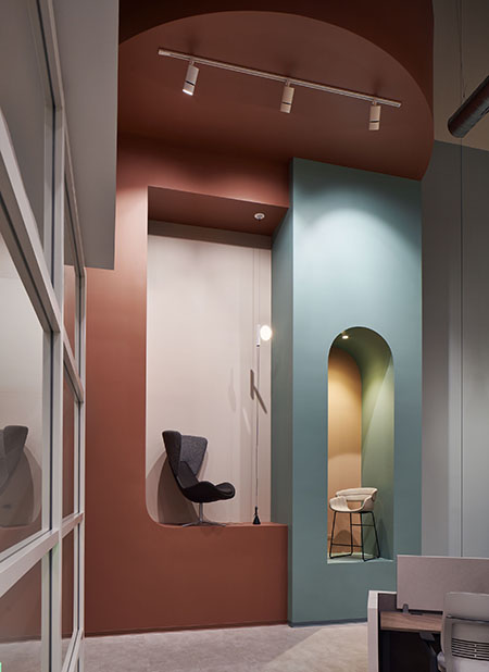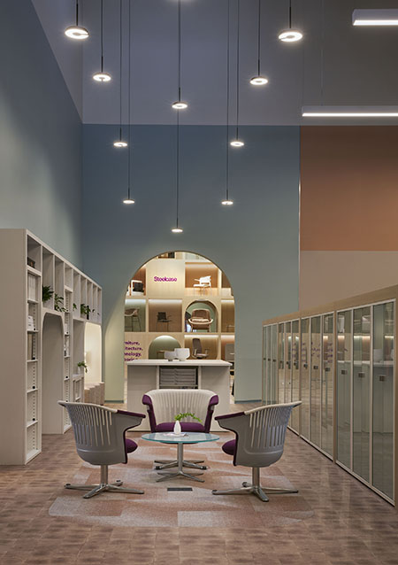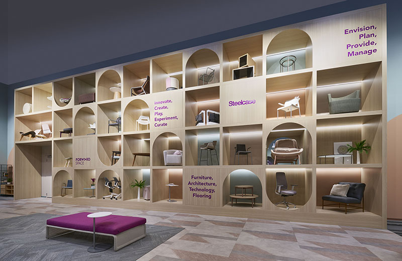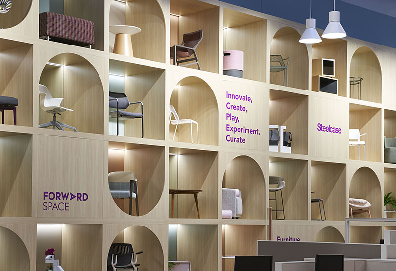 Yet, the design team made sure to use a lighter hand with emblems and signage. They relied on other components to provide an environment that showcases the individual lines on offer, and still highlight the essence of Forward Space. “In the early days of office design, people felt that they needed to bring specific colors throughout and that the logo needed to be everywhere. Here, we focused more on the experience that we wanted people to have. We set the tone and emphasized the brand in that way, instead of using the old color and logo concept,” said Kuchar.