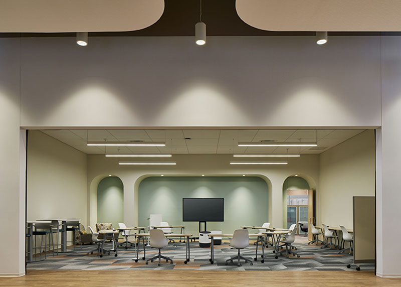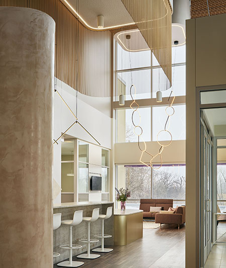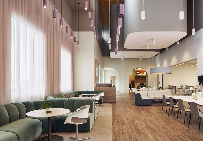 The heart of the Forward Space experience is the WorkCafé, a Steelcase hallmark found in their offices around the world. A WorkCafé is an alternative, or “third” place where people can meet, work or socialize. Rather than a basic cafeteria, it is meant to foster collaboration and innovation. Kuchar gave it a lighter, resimercial appeal to make it a destination. “It is very much like a meeting and lunch area space combined, but still very corporate in nature. In the front, we created a beautiful entrance. It’s unique for this space, not standard for a WorkCafé,” Kuchar added.