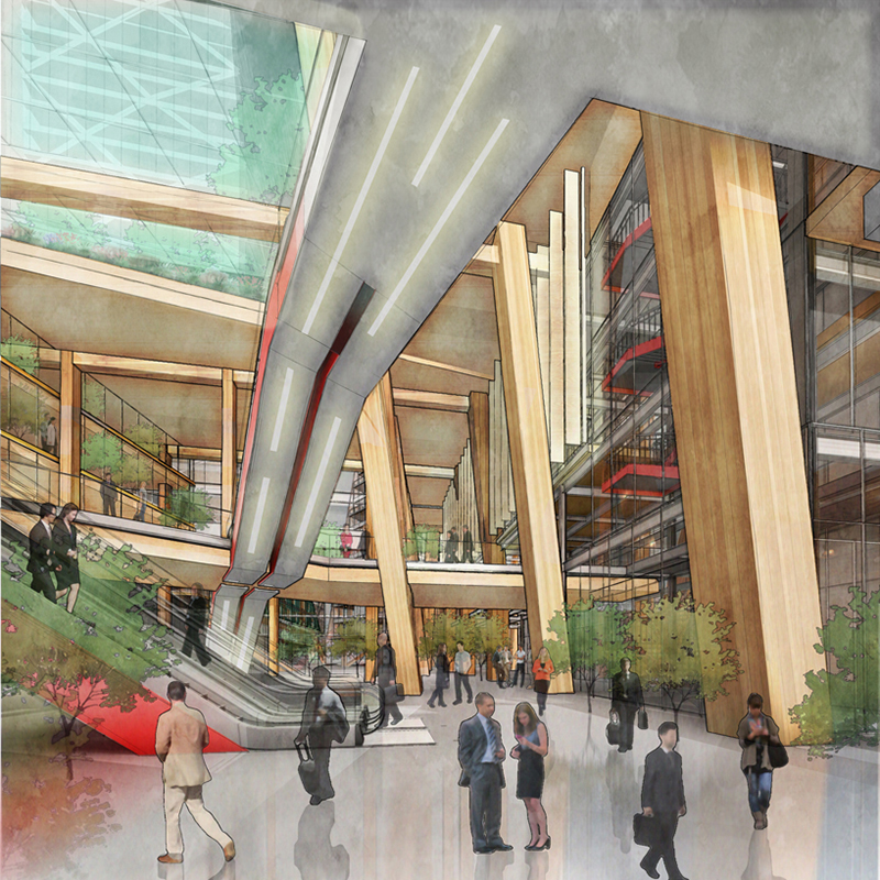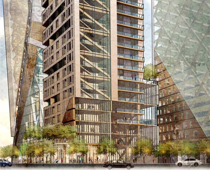 “We were very interested in figuring out how to build atop our existing cities, in ways that wouldn’t destroy the existing city fabric, but helps solve these really pressing density issues,” says Jose Brunner, a designer at DLR Groupand advocate for mass timber architecture. “We were able to design something that would be built atop an existing building, with a lightweight product that wouldn’t detract the integrity of the existing building.”