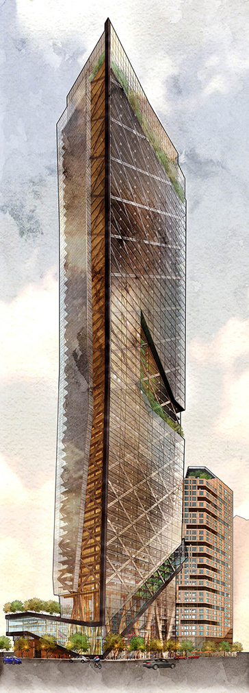 “Architects at Perkins+Willand engineers at Thornton Tomasetti have conceptualized the 80-story River Beech Tower, a mass timber building in Chicago that would have 300 duplex units using an exterior diagrid system that leverages the natural axial strength of timber. This concept has been informed by the recent Skidmore, Owings and Merrill Timber Towers research that shows that timber-concrete hybrid systems can support loads of 82,000 pounds (8 times the required load) along with some steel hybrid systems that could be marketable in terms of bay sizes and floor openings.”