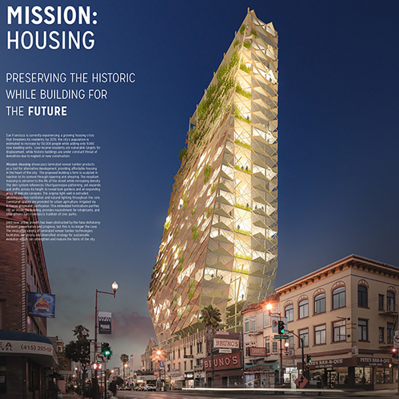 “Jose Brunner, a designer at DLR Group’s San Francisco office, designed a timber tower atop a landmarked building in San Francisco’s Mission District for the Mission: Housing design competition, and is a strong proponent of mass timber for multi-family architecture. The current building code in San Francisco isn’t very accommodating for timber construction methods but did mention that there will be a vote to change those local codes in the next few months.”