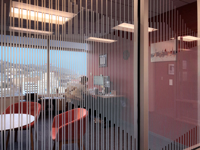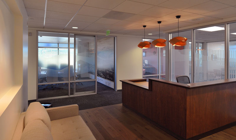 “We took these iconic mountains, and created these designs with lines, so you have to look closely at them to decipher. It’s meant to be a discovery experience as you move through the office. The film allowed us to bring in the light and give them the privacy they wanted, while still having that visual connection,” Campbell noted.