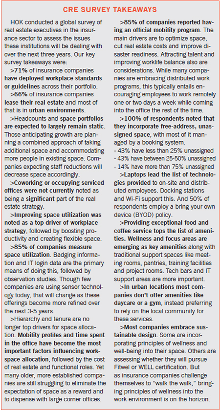 In addition to HOK’s Workplace leadership team and its global delivery network partners, HOK worked with insurance company contributors, including CRE and facilities leaders from AIG, Goosehead, Horizon Healthcare, Horizon Blue Cross Blue Shield of New Jersey, Liberty Mutual and MetLife. Research techniques included a global survey of insurance services firms, followed by a series of interviews with decision makers from several leading companies.