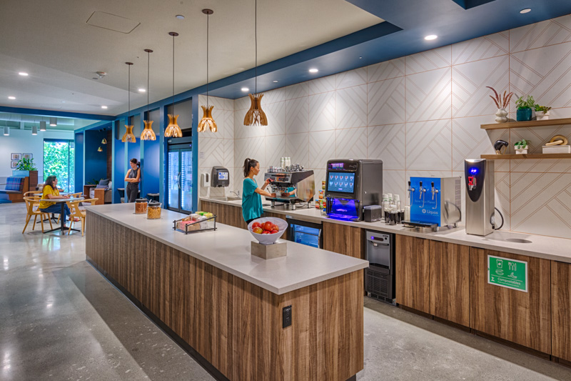 The square footage you have available in your building will be a key factor in determining what type of food and beverage space to incorporate. For some of our larger clients with campus-style facilities, there’s often room for a full-service café, as well as what we think of as elevated breakrooms on each floor of a building. But for other clients who may be in a smaller building or occupy a single floor of a larger building, self-service breakrooms are a great option.