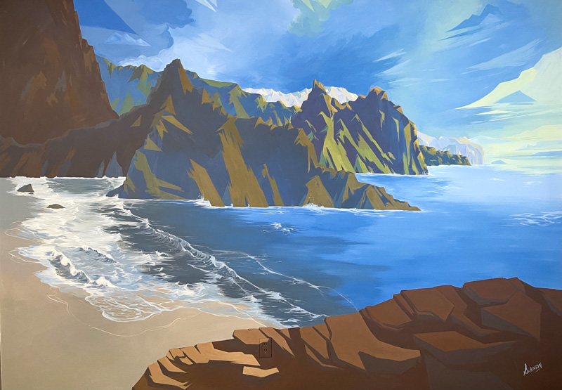 Ā We are seeing clients incorporate wallcoverings into their spaces which showcase their culture. Art isĀ also an essential element for boosting morale and feeding the soul of any company. To complete our FKĀ Design Lounge, we commissioned Stephanie Hunton, who is studying illustration at Ringling College ofĀ Art and Design, to paint an 8 x 12-foot seascape mural designed with geometric shapes and incorporating the roomās contemporary color scheme and patterns. The vision of the artist and the piece pulls the entire design aesthetic together through art. The idea of the seascape came from Stephanieās imagination. She played around with several thumbnail ideas before starting the painting.