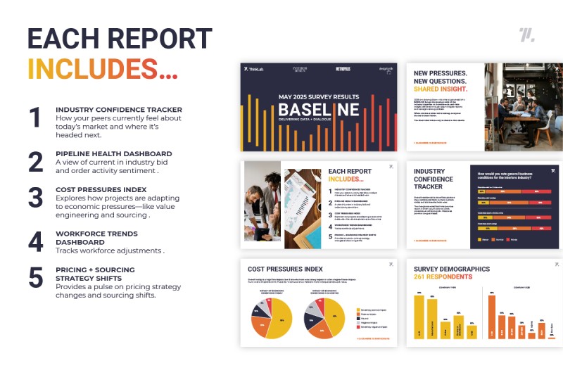- The BASELINE Survey This quarterly survey will provide a pulse check on industry sentiment, quoting vs ordering, employment, cost pressures index, and more. It’s open to anyone in the ecosystem: manufacturers, dealers, reps, A&D firms even end users, but access to the results operates on a give-to-get model: you must participate in order to receive full data access.