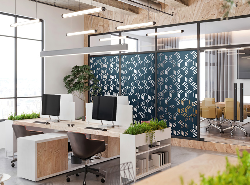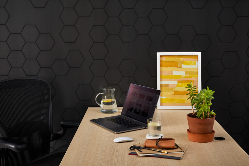 At BDNY in November, the company is previewing Transparency, the latest addition to Surface Mode. Laser-cut and powder-coated on .062” and .09” aluminum sheets, Transparency is the newest way to divide spaces. The nine designs include classic linear motifs and biophilic curves that bring a contemporary aesthetic to interiors. “We see screening with felt and other materials,” Schaefer said. “And we are doing that here with shapes and visual and actual transparency.”
