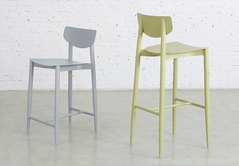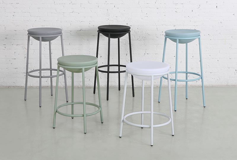 The ROTO collection of barstools and side tables, introduced last year, is one example of m.a.d.âs penchant for exploring new materials. Its playful design takes shape through a roto-molded plastic casting process, and can be used anywhere from a collaborative breakout space in the office to an outdoor patio or a residential playroom. The side tables can be turned upside down and used as seating for added versatility.