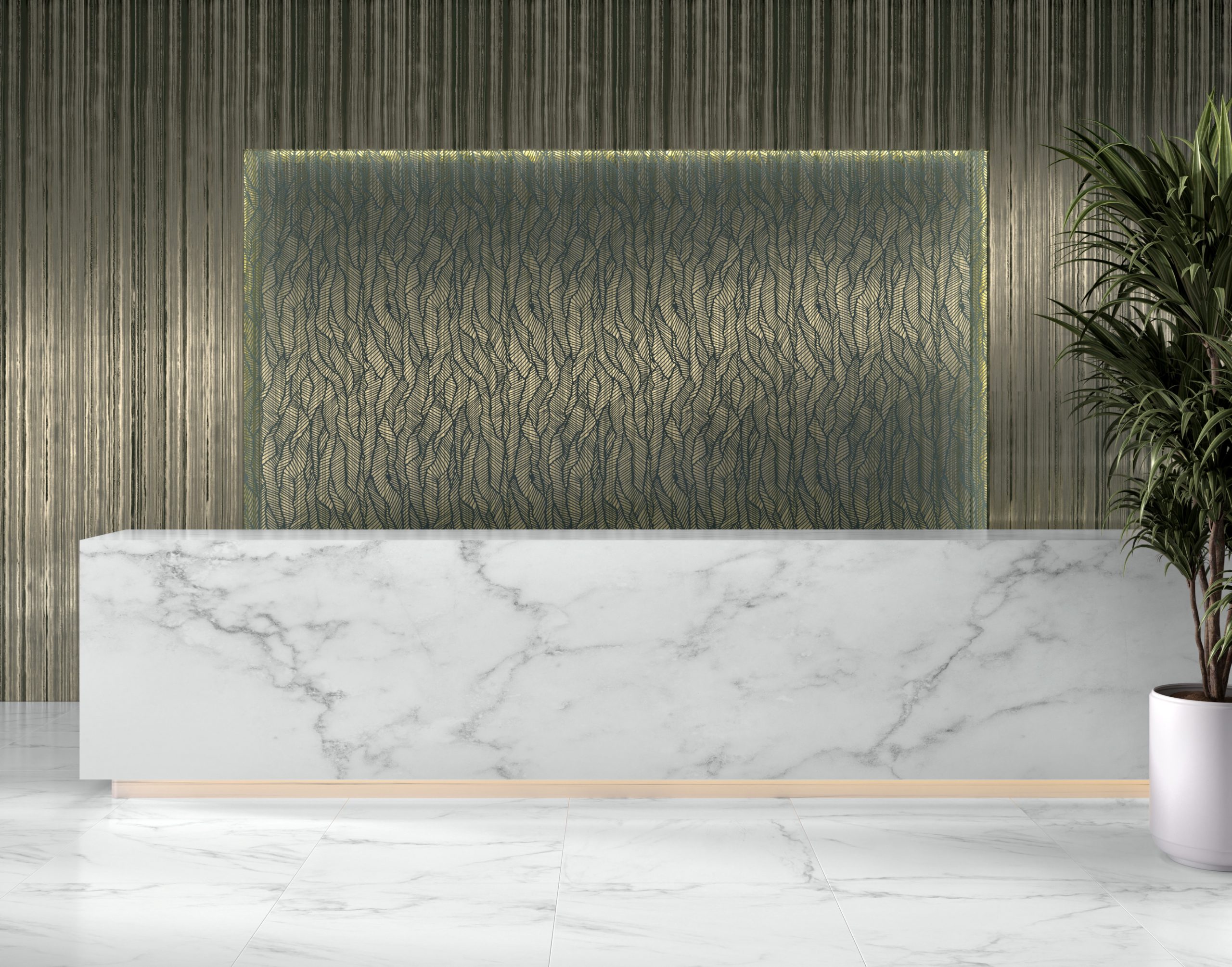 Designed with the hospitality market in mind, Amari Stipe is a dramatic, feature-wall type wallcovering with a 3-D handcrafted look inspired by the work of fashion designer Iris van Herpen and developed to sing in harmony with Amari; a beautiful pattern based on a leaf motif.