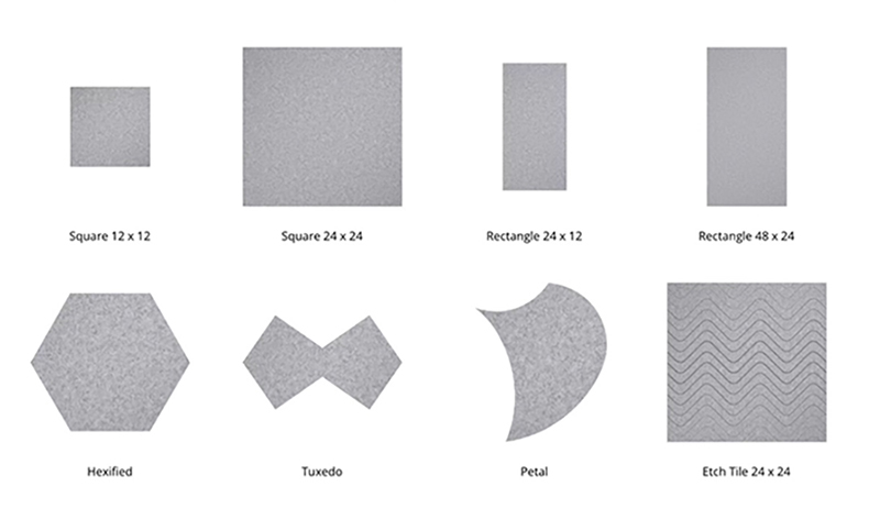 With six shapes, and etched, printed and solid color tiles, Shapes and Tiles are building blocks designers can use to enhance a humdrum space while adding acoustic properties.