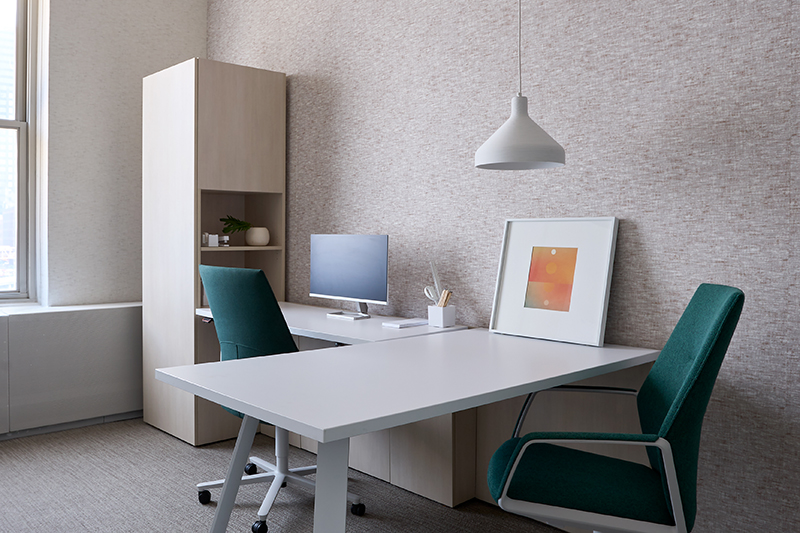 Panels are just that – large rectangular panels for wall mounting that are available in solid colors, textured colors and etched or printed ‘Statement Patterns’. One of my favorite installations at NeoCon was a private office with Clara Silk acoustic panels covering one wall while the opposite wall was covered with a traditional wallcovering that had been printed with the Clara Silk pattern and colorway.