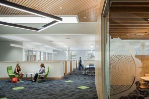 On other DIRTT glass walls, the Rowell Brokaw design team applied graphics of forest skylines and cross-cut timber trunks, offering a touch of privacy to glass enclosed spaces while also embodying the company’s vision and mission to provide superior wood products in an amusing way.