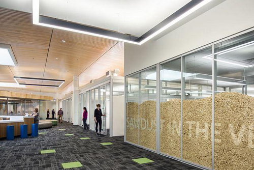 The most eye-catching solution is a double-glazed wall – what DIRTT calls an “Evil Twin” wall – with sawdust and wood chips dropped into it, filling the wall about halfway.