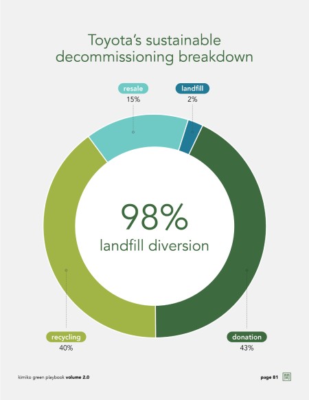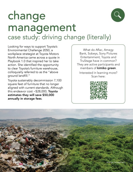 Take Toyota Motors North America, for example. After hearing the phrase “above ground landfill” during a kimiko green roundtable, their team was inspired to take a closer look at their own storage practices. The result? They cleared out an entire warehouse of unused furniture, most of which no longer met their internal standards, diverting 98% of it from the landfill through resale, donation or recycling. The cherry on top: They’re now saving $50,000 a year.