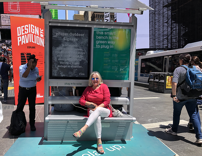 >SOLSTREET, a solar-powered bus stop type shelter with a roof of solar panels powering easy to access charge ports and a bench to sit on while charging. Designed by veteran NY industrial designer Lisa Smith, Solstreet is entirely self-contained with its solar panels on the roof and batteries under the bench. The unit is controlled by an App and offers an interactive bulletin board of E-Ink along with ad space.