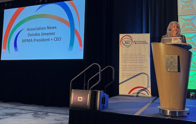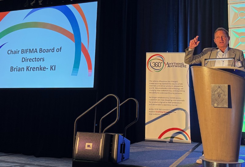 KI President and Chief Executive Officer Brian Krenke, who is serving a term as BIFMA board chairman, welcomed everyone to the conference. “The future of the industry will be determined largely by the people in this room,” he said. “There are other (events), you’ve got the NeoCon, Design Days, Clerkenwell, Orgatec and other venues where you can (develop your network), but this is really a terrific venue for all of us to broaden our network. For me, 360 helped me develop friendships in the industry.”