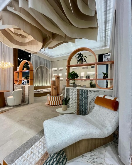 Decorated with a range of emerald hues, furnishings made from recycled paper, and eco-friendly carpet tiles by Ege Carpets, this central spot helped to set a calming tone during the busy fair. “The Mainstage offered a tranquil environment for attendees to gather and collaborate, while the thoughtful use of mindful materials reflects our commitment to creating beautiful, comfortable, and sustainable spaces,” explained Alex Lerian, general manager at Ege Carpets Americas.