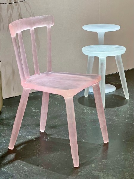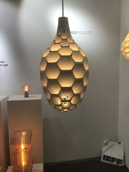 Canadian studio Larose Guyon displayed their handmade light fixtures in an ethereal booth swathed in sheer fabric. Co-founder Audrée Larose explained that it took six months for everything to come together, from initial design to completion. It was a favorite of the judges and attendees, winner of best in show and exhibition design ICFF awards.
