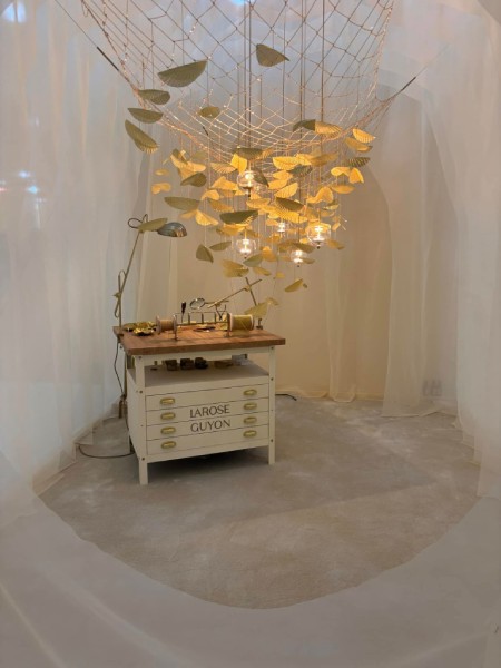 Nature is the prime inspiration for Larose and co-founder Félix Guyon, and the pieces on view had aged brass elements shaped like leaves. As people moved through the space surrounded by a warm glow they stopped to touch the material and savor a rare, quiet moment amidst the buzz.