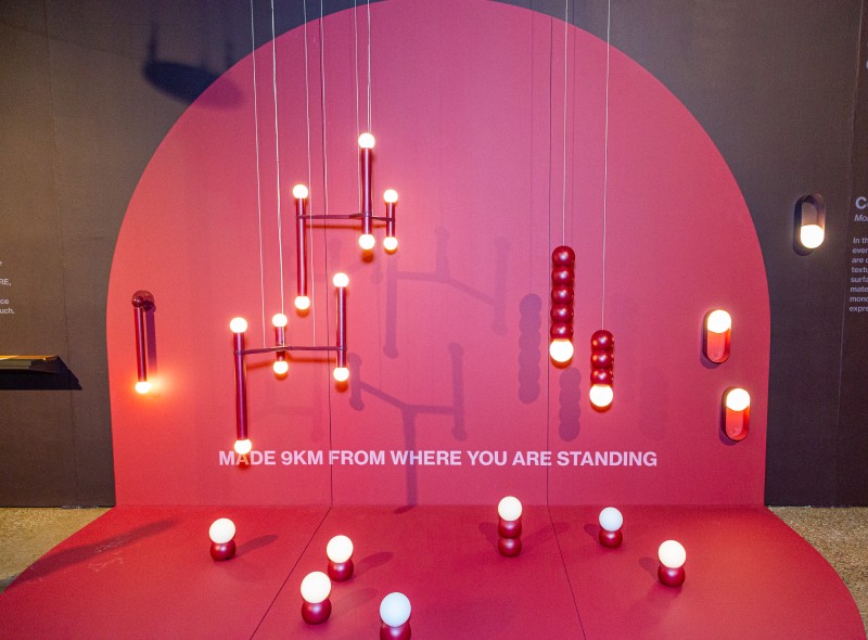 Facing the main entrance to the show floor was the booth of lighting-and-furniture maker Hollis+Morris, based just five miles away. The booth featured Colour Drench, an in-your-face demonstration of a saturated hue, in this case crimson, repeated on wall, floor and furniture. The firmâs wood-and-metal pendant, sconce and freestanding lighting fixtures were wrapped in sound-absorbing, knitted fabric from Dutch textile supplier Byborre. The booth won the Judgesâ Choice booth award.