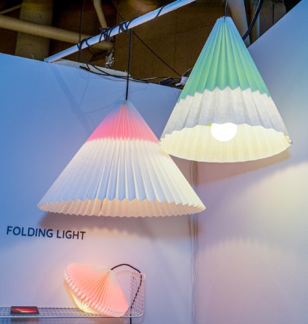 Meanwhile, over at lluminate, Jeff Forrest greeted visitors to his booth for Stackabl, a line of bespoke yet affordable, sound-absorbing lighting made by stacking felt offcuts and other industrial waste into memorably stylish and original fixtures that evoke shish kebob and the color bands on an electrical resistor.