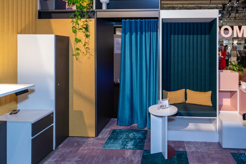 At How We Work, Un/Confined was a concept installation designed by Toronto-based Syllable Design featuring Three H Furnitureâs Kynde conference table, Hudson private office, Harris lockers, Sutton zoning and Lady Ev accent table. Three H is based halfway between Toronto and Hudson Bay in New Liskeard. The booth highlights the return-to-work shift from rigid, one-size-fits-all offices to flexible spaces that support autonomy and movement.