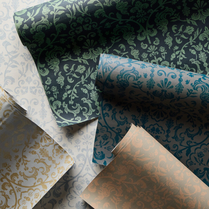The Clean Vinyl wallcovering collection, with the Empress Filigree and Hutton prints as prime examples, comes in blue hues reminiscent of the ocean, as well as browns and greys that replicate lush green forests and various flora. The use of warm woods, cork, and natural fibers underscores the hospitality industry’s growing commitment to sustainability and eco-conscious luxury. These tones are also a nod to the renewed appreciation for the Arts and Crafts movement, where inviting maximalism meets craftsmanship.