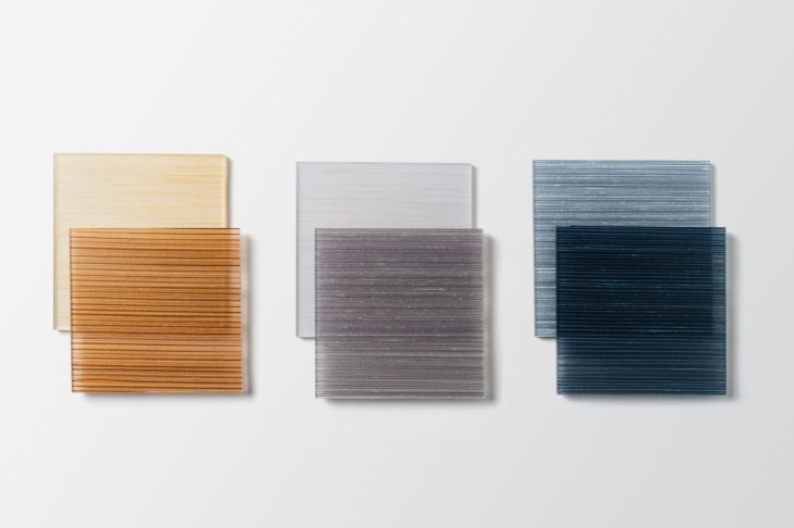 To complement the three textiles, 3form introduces a new colored glass etch product inspired by the textiles’ gradient motif and slubbed yarns. Horizon Etch features a horizontal linear pattern of pleasantly imperfect lines that are concentrated toward the bottom of the glass panel and gradually disperse toward the top. Horizon Etch is available in Orbit (dusty blue), Steep (neutral taupe), and Meteorite (dark grey), which enhance the etched pattern and instantly add depth and intrigue to the laminated glass panels.