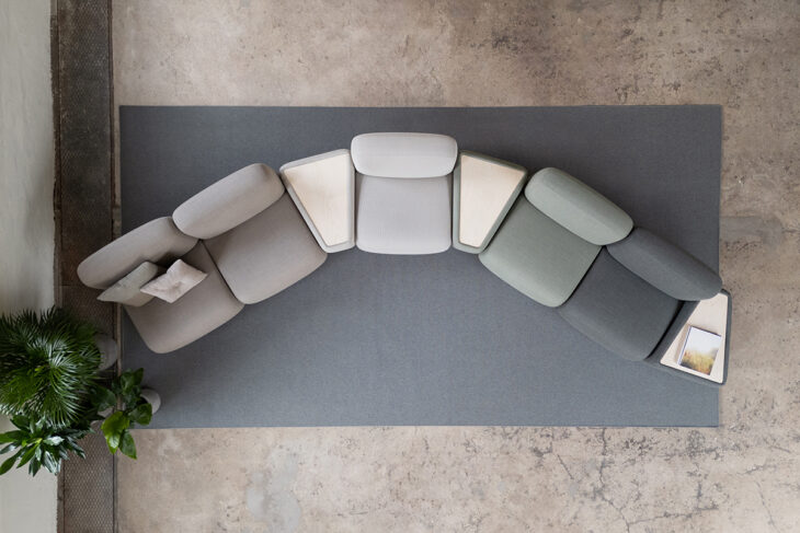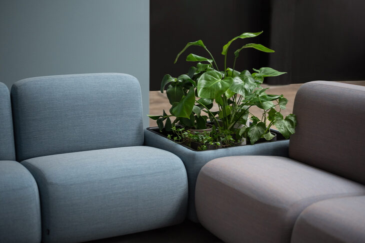 The series includes straight and curved modules, side tables, planters, and tables. Sustainability and environmental impact have been essential aspects of the design process. Each module is padded with PurFlex® Biomass Balance moulded polyurethane foam, a sustainable raw material that significantly reduces the product’s carbon footprint during manufacturing. The wood comes in white-pigmented or black-stained ash veneer. Castor options are available for smooth transitions. The modular sofa’s incredible versatility and customization make it suitable for a wide range of spaces, from offices and reception areas to collaborative spaces and lounge areas.
