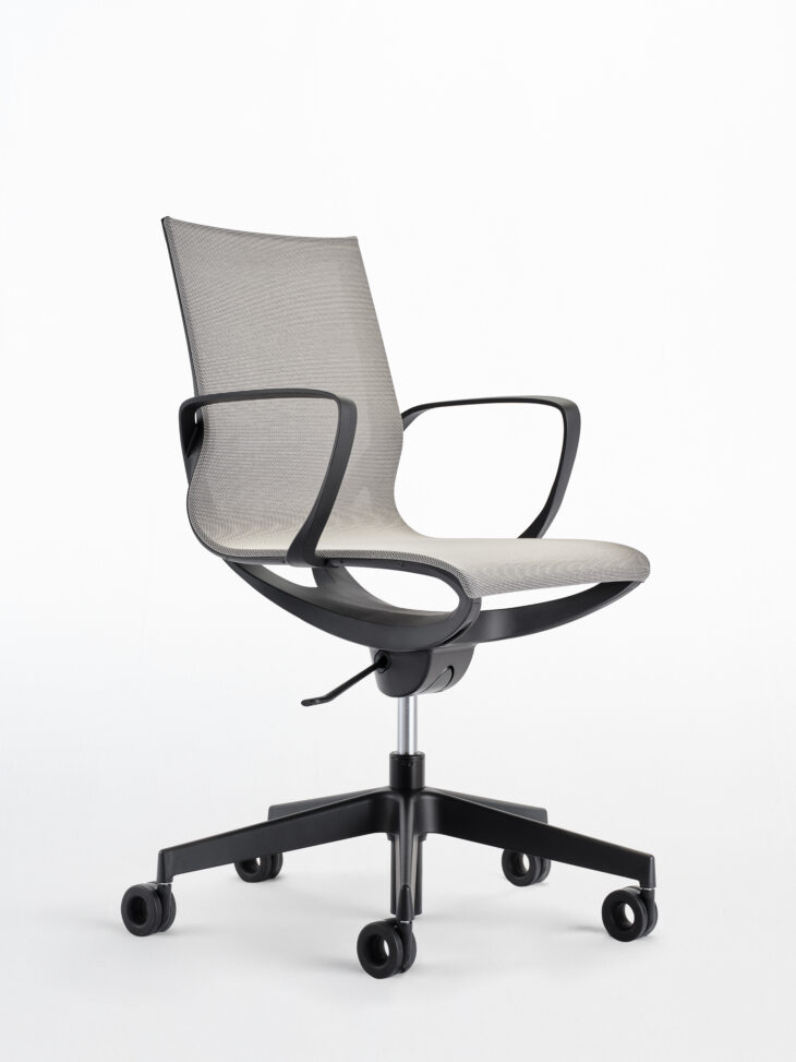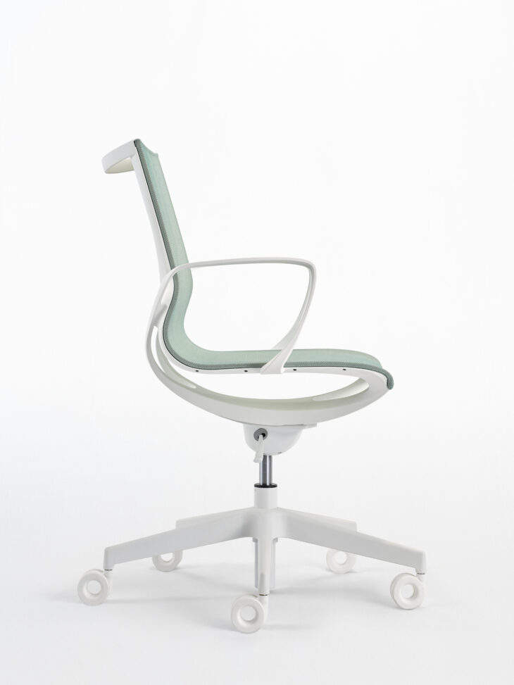 Roya’s self-supporting mesh seat and back contour to the body’s natural curves, while its flexible spine allows users to recline with ease. Standard features include pneumatic height adjustment, tilt with lock, integrated arms, and lightweight frame options in black or white. Unique hollow casters and four mesh color options—black, grey, teal, and white—expand design possibilities.