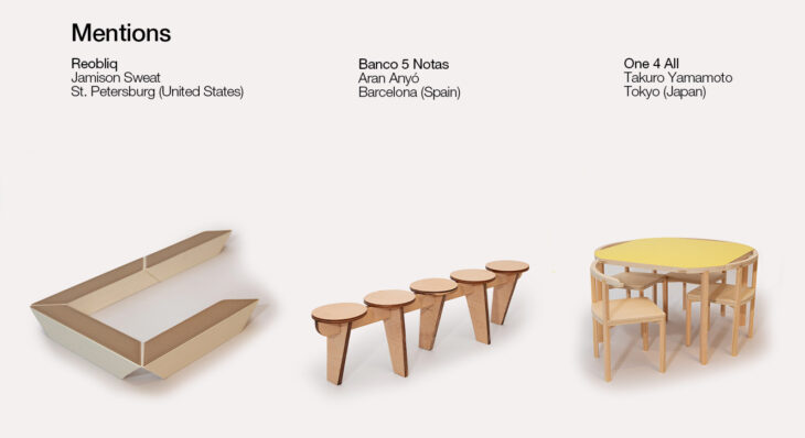 The jury, composed of leading figures in design, architecture, communication, and sustainability, such as Pilar Marcos (Interior Design, Spain), Erwan Bouroullec (Industrial Designer, France), Sonia Manchanda (World Design Organization, India), and the creative duo of Anna Devís and Daniel Rueda (Photographers and Architects, Spain), evaluated more than 200 projects. In addition to the main prize, honorable mentions were also awarded to three designs that stood out for their creativity and conceptual relevance: Reobliq, by American designer Jamison Sweat; Banco 5 Notas, developed by Aran Anyó (Spain); and One 4 All, by Japanese designer Takuro Yamamoto. Each of these projects offers a unique vision committed to contemporary design values, reinforcing the diversity and international scope of the contest.