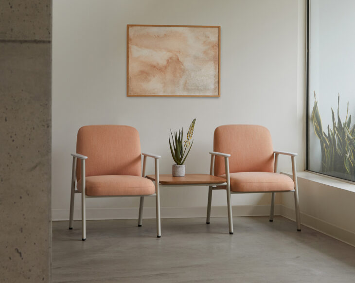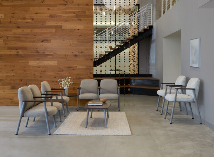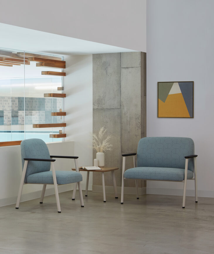 The full collection includes guest chairs, a bariatric settee, tandem seating, easy-access/hip chairs, benches and occasional tables, each sharing a cohesive design language for consistency across entire floorplans while responding to distinct usage needs.