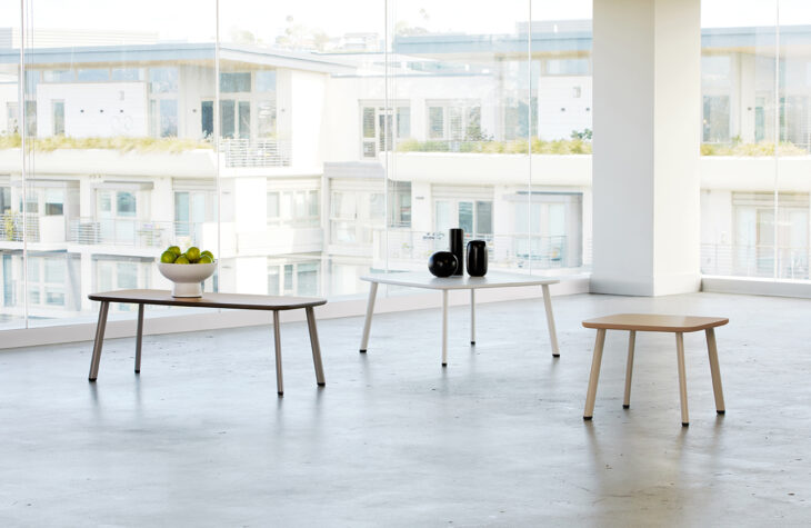 > Accompanying occasional tables available in rounded square and rounded rectangle shapes.
