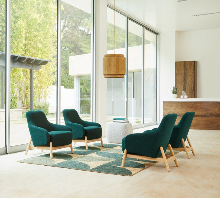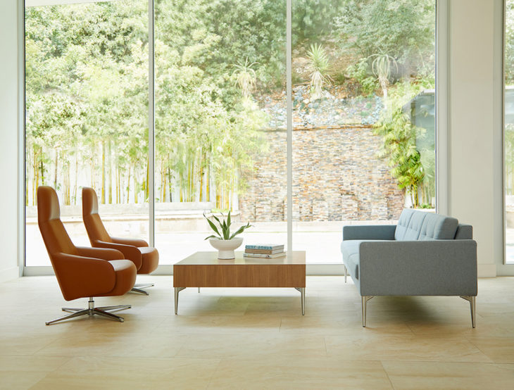 Both the lounge chairs and ottoman are available with an aluminum swivel base that comes standard with an auto-return feature to ensure models are always returned to their proper position for a neat and tidy appearance. A signature angled 4-leg wood base is also offered on lounge units that adds a warm, organic quality while cradling the upholstered elements to create an aesthetically balanced look.