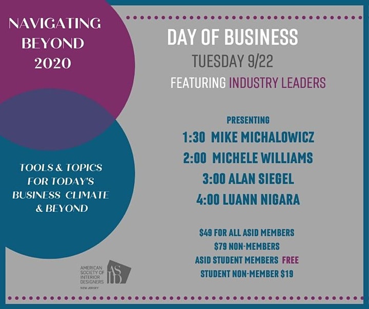 The New Jersey Chapter of the American Society of Interior Designers (ASID) will host an afternoon of virtual seminars entitled, “Navigating Beyond 2020: Tools & Topics for Today’s Business Climate and Beyond” on Tuesday, Sept. 22. Industry leaders to be featured include: