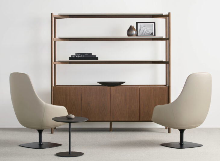 The Larkin credenza is offered in three sizes—57”, 75”, and 87” wide—and can be used independently or paired with one or more Larkin meeting tables to create a cohesive and modern work environment. “Great pieces need to be flexible in both function and attitude. Larkin works as well in an open space as it does in a conference room; it can be casual or formal, depending on the finish and accessories specified,” says designer Cory Grosser. The Larkin collection is a testament to Bernhardt Design’s commitment to blending modern aesthetics with thoughtful functionality, making it the ideal choice for creating versatile and inspiring workspaces.