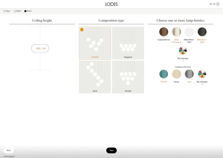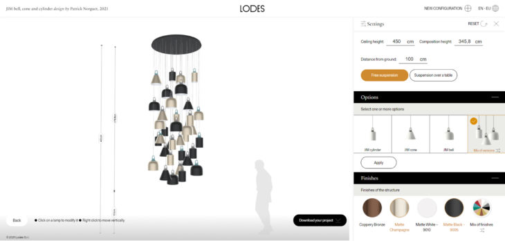 Lodes’ Managing Director Massimiliano Tosetto comments: “At Lodes, we believe that personalising living spaces with light should be simple, accessible, and effective. With the new product configurator, we bring to market a tool which is easy to use, simple, immediate, functional, and which allows instant visualisation of the compositions.”
