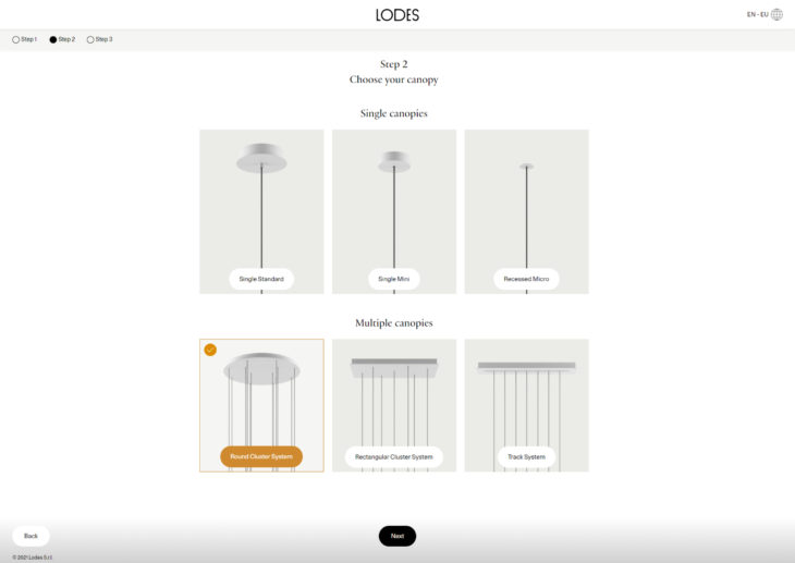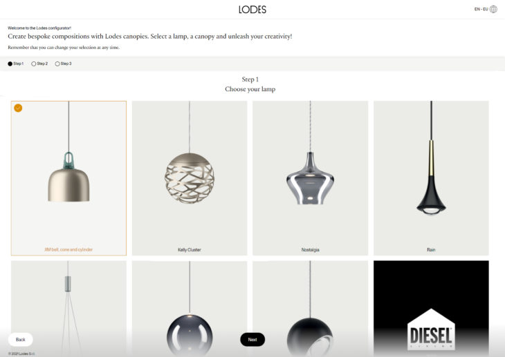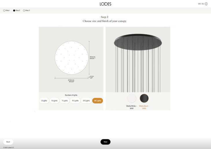 The configurator is an accessible online tool, which allows users to choose a lamp and a canopy to fit their project and then save or share the resulting design. Lodes launched its first product configurator in 2015 to bring its products closer to users. The latest version of this tool allows users, from consumers to designers and architects, to create accurate and immediate product renders and creative lighting solutions.