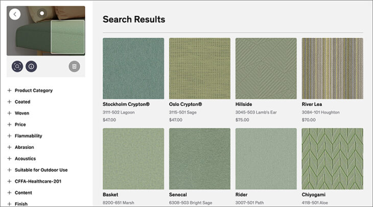 The use of image searches and AI is on the rise among designers, helping simplify product discovery and offer alternates with ease. The change allows for faster workflow, expanding options and zeroing in on products that meet specification needs using filters. Using Image Search, a user can quickly find what they’re looking for, order a sample, and place an order.