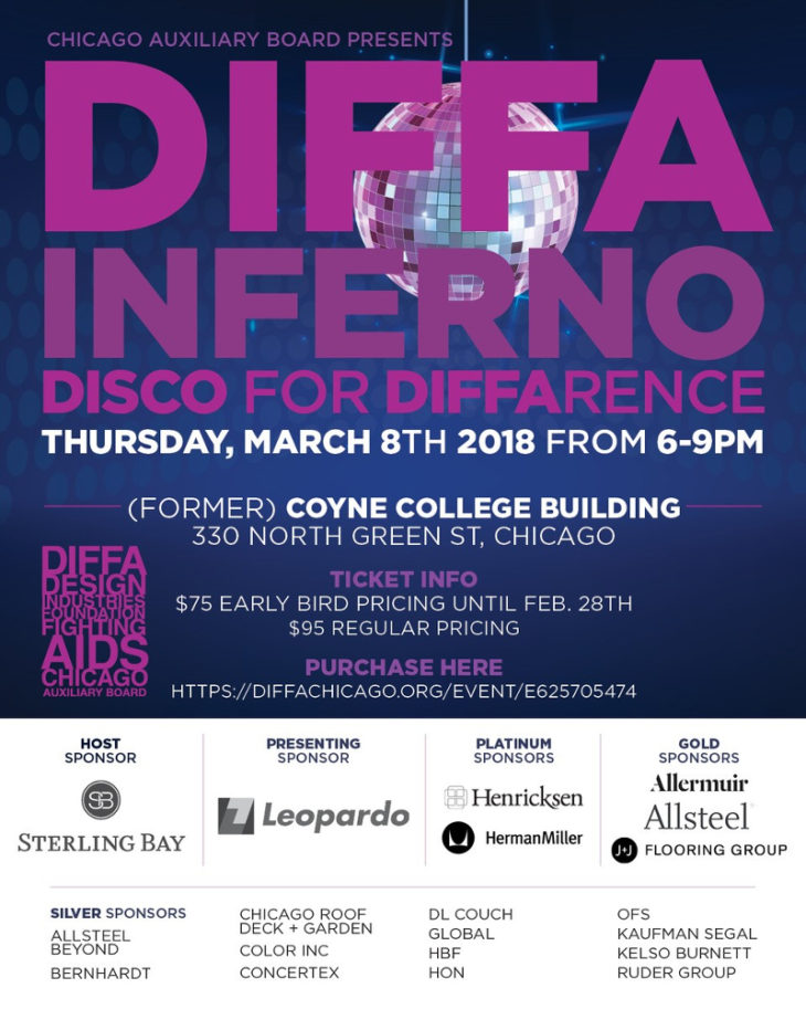 What: The Design Industries Foundation Fighting AIDS/Chicago (DIFFA/Chicago) Auxiliary Board will host its sixth annual DIFFArence event on Thursday, March 8, 2018 at the (former) Coyne College Building in Chicago’s Fulton Market District. The evening will follow suit with previous year’s “DIFFArence” events with an exciting disco inferno theme to heat up the conversation around the organization’s ongoing efforts. Design and business professionals will get their groove on in sequence and flare jumpsuits to celebrate the advancements made towards the HIV/AIDS community.