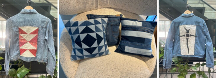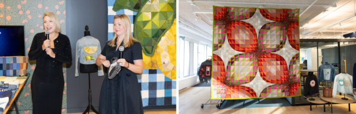 Left to Right: Abigail French, Regional Vice President at Steelcase and Katie Buhl, Associate Principal at Unispace; Upcycled quilt and jackets