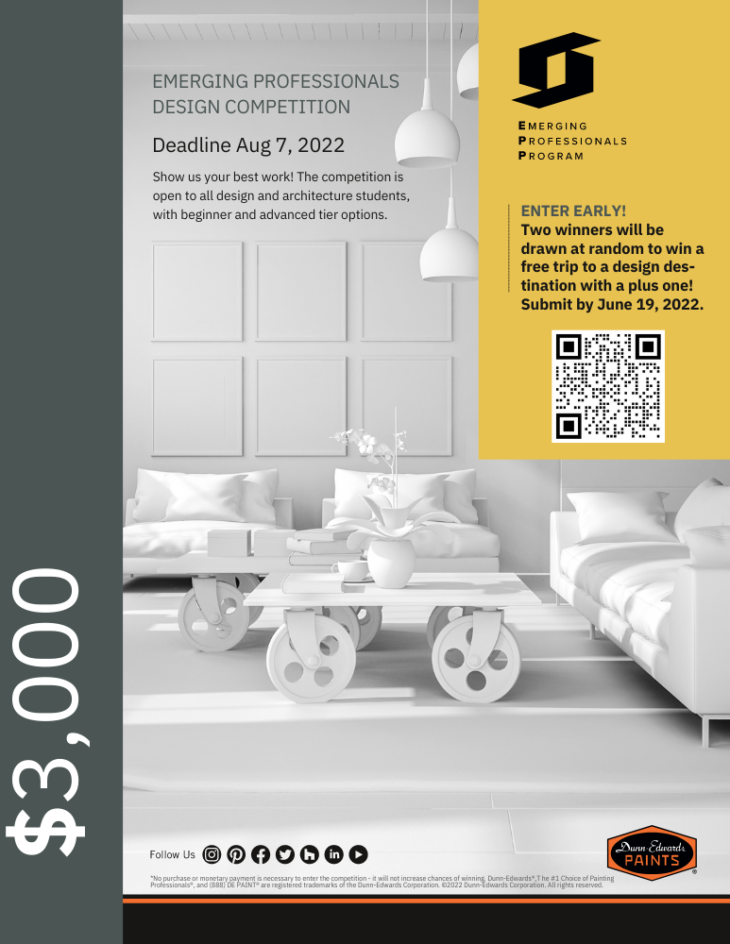 Dunn-Edwards opened its second annual Emerging Professionals Design Competition for students today. The competition is open to students nationwide. Eligible emerging professionals of architecture and design who are enrolled in school can apply online by August 7, 2022. There is no fee to enter. Winners will be announced by August 31, 2022.