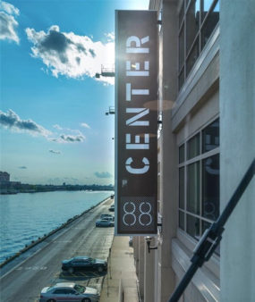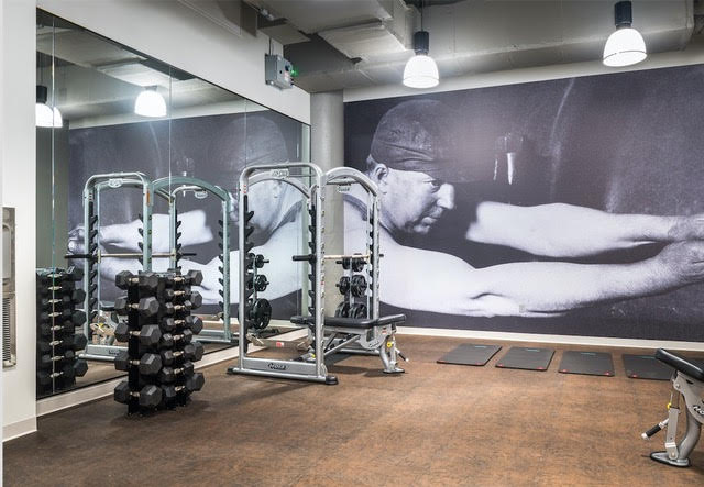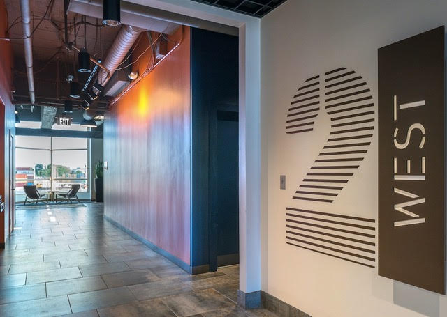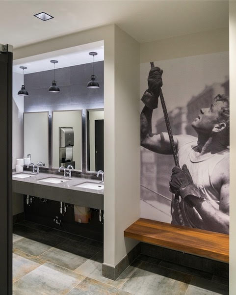 Building on the industrial history of the property, the entrance to the site is now marked by the “88” brand in dark, bronze metallic signage and by a series of striking oversized, backlit panels featuring the boat building images photographed by Alison Shaw. The multiple building lobbies now feature bronze metal and wood plank-lined walls with oversized graphics and bold colors that lead to a state-of-the art fitness center, newly envisioned café with new floor-to-ceiling windows, new solarium seating area with water views and industrial-chic light pendants and sconces. The design is enhanced by new custom furnishings made of natural wood and industrial pipe fittings. Additional interior improvements include bright, art-filled corridors, a colorful, convenient bike storage room, renovated restrooms with wall-size historic photos of dockworkers and new laser-cut signage and applied graphics throughout the common spaces.