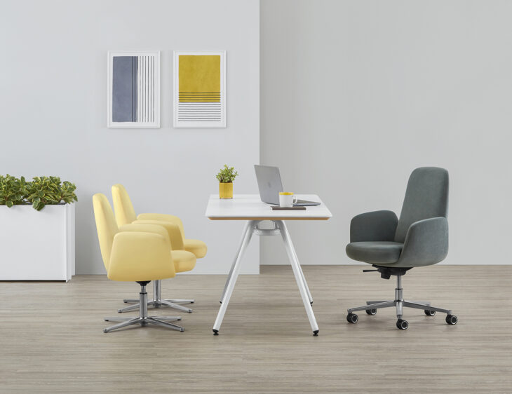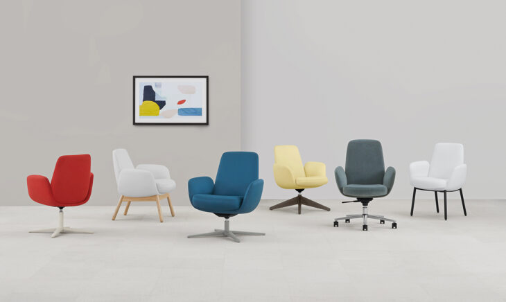 Soft, pillowy shapes and continuous flowing lines define the collection, creating a design language that seamlessly blends visual appeal with a welcoming presence. Available in mid- and high-back models, Plumeya’s modern silhouette is complemented by a broad range of wood and metal base options—including four-leg and swivel, as well as a die-cast aluminum base with chrome-accented casters on conference chairs. A built-in self-return on swivel models ensures a tidy appearance when not in use, while an optional rocker feature on lounge chairs introduces gentle movement, enhancing relaxation and encouraging casual moments of respite.