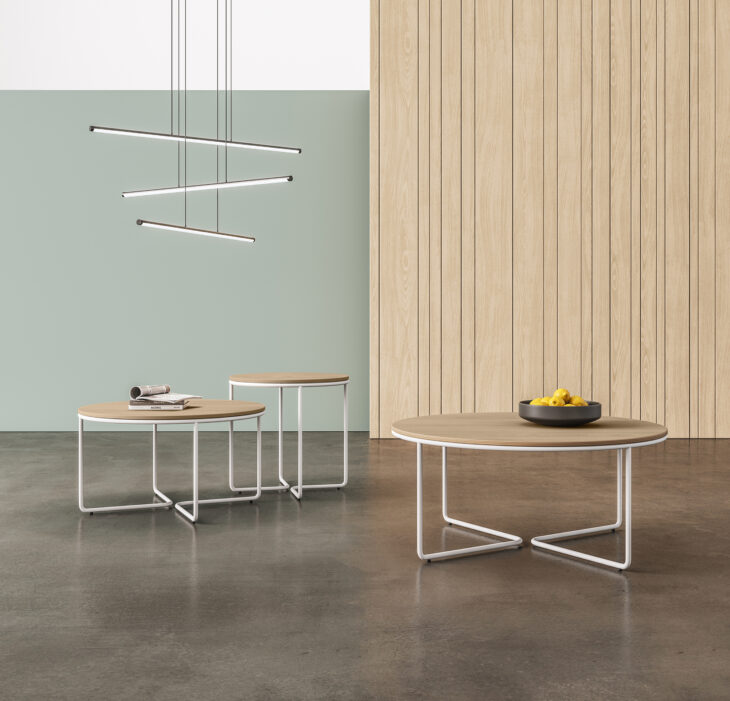“We drew inspiration from the idea of creating a series of tables that are distinct in their detailing yet universal in function and appeal,” says Chris Panichella, Principal Industrial Designer at Achella Design. “The word ‘Outset’ refers to the beginning of something, the start of an event or a journey. In our case, the journey begins with a seamlessly rolled, thin steel tube that loops around the perimeter of the table top and joins with a precisely bent steel leg. These legs approach each other, but never meet, creating a playful geometric tension that is sometimes elusive to the eye.”